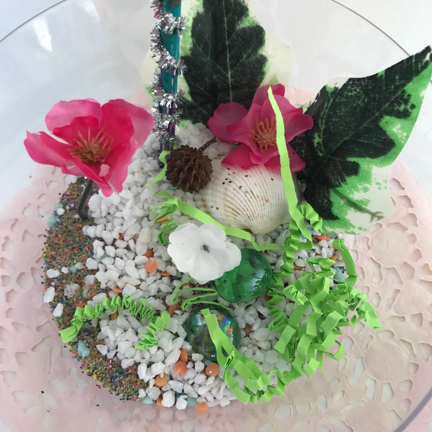 First have the kids add around half an inch base of glitter to the bowl. Then they may start adding the sand, the rocks and all the other loose parts and flowers as they wish. Creating patterns with the rocks and pebbles can be fun, or maybe just adding flowers and sticks...Anything goes! At the end we added Fairy spray to all the gardens!